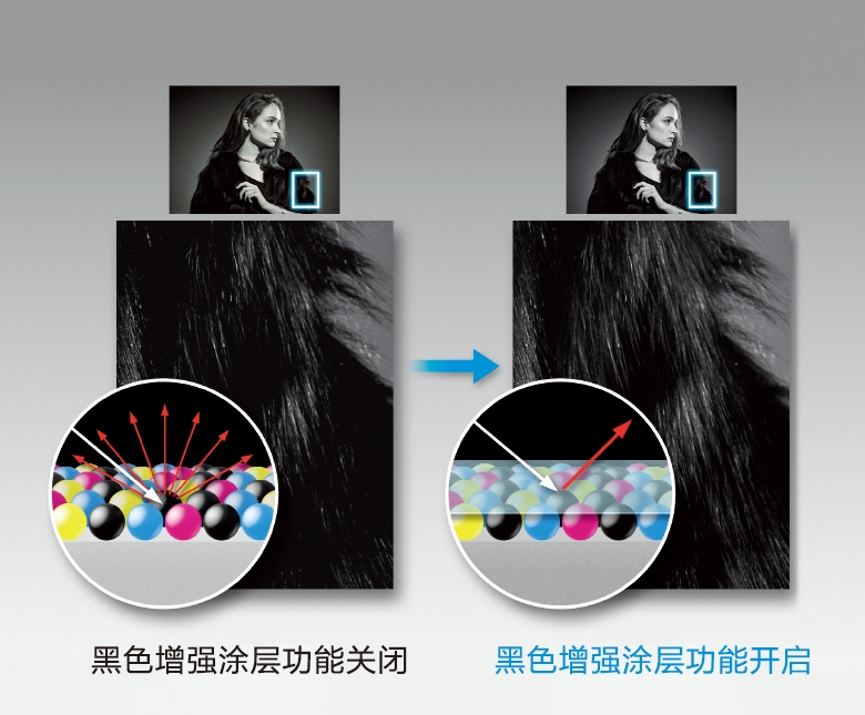 提供更濃厚的黑色呈現,絕佳的對比,極優的色調,並且抑制因光線反射而產生的色差(bronzing reduction),讓需要高品質的海報及相片作品,能以最完美的方式呈現。