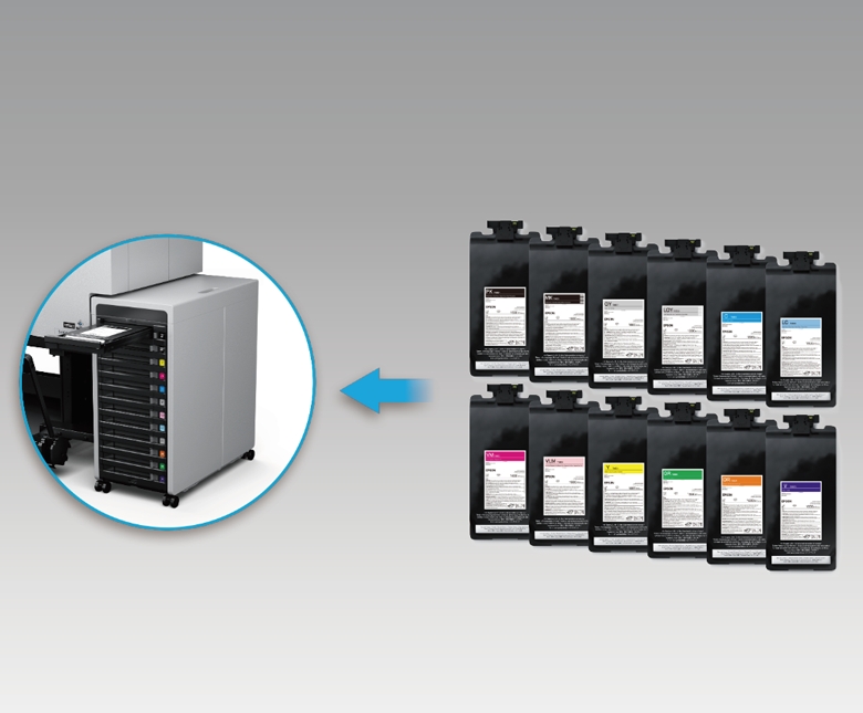 採用大供墨系統,每種顏色可容納12個1.6L墨水包。不僅降低營運成本,並減少了墨水更換工作的頻率。