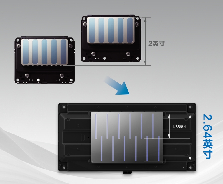 • 2.64吋PrecisionCore Micro TFP單噴頭,噴頭尺寸大1.3倍,生產速度最高提升11%,最高產能達 119.4㎡/h