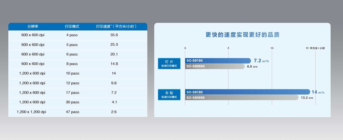 SC-S9130採用全新2.64吋PrecisionCore Micro TFP單噴頭,相較於舊機型1.0吋的雙噴頭,噴頭尺寸大1.3倍,噴嘴數量從7200個增加為9600個,生產速度相較於舊機型最高提升11%,不僅有效提升產能,亦同時兼顧列印品質,加上Epson最新佈點技術,減少了刷線和顆粒感,最高解析度可達1200 x1200 dpi,最高生產速度可達119.4㎡/h。