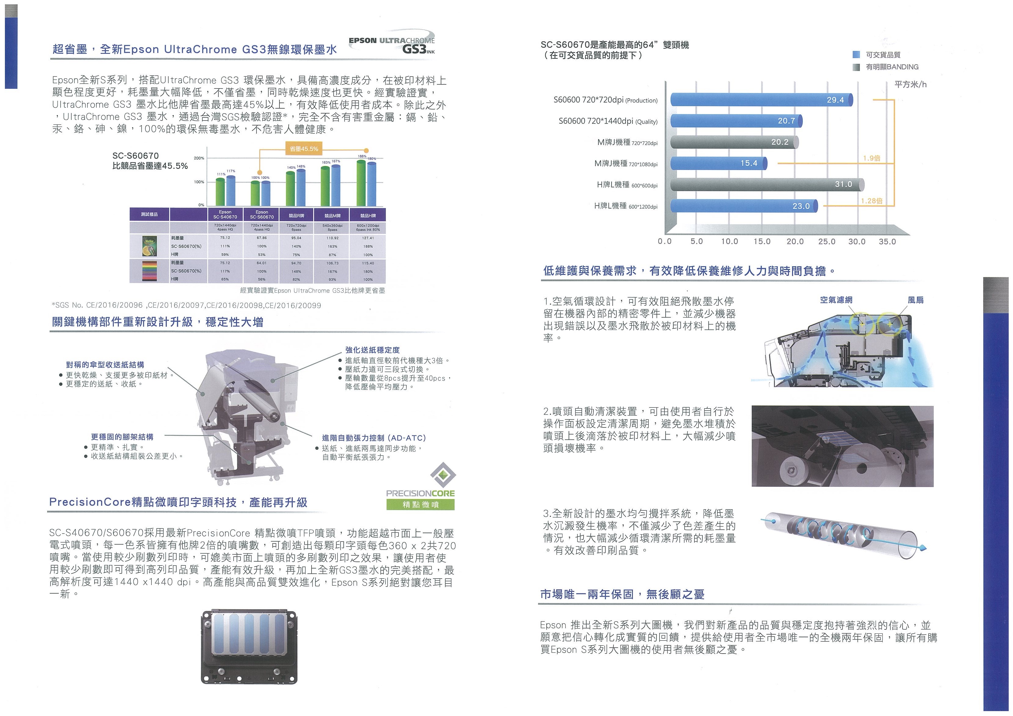 極黑純色業界首選。超省墨,全新UltraChrome GS3無鎳環保墨水,最高比他牌省墨達45%以上。超穩定,關鍵機構部件重新設計升級,展現優異的列印精準度與可靠度。市場唯一兩年保固,無後顧之憂,讓您安心印,輕鬆賺。PrecisionCore精點微噴印字頭科技,與墨水完美搭配,影像效果大躍進。低維護與保養需求,有效降低保養維修人力與時間負擔。